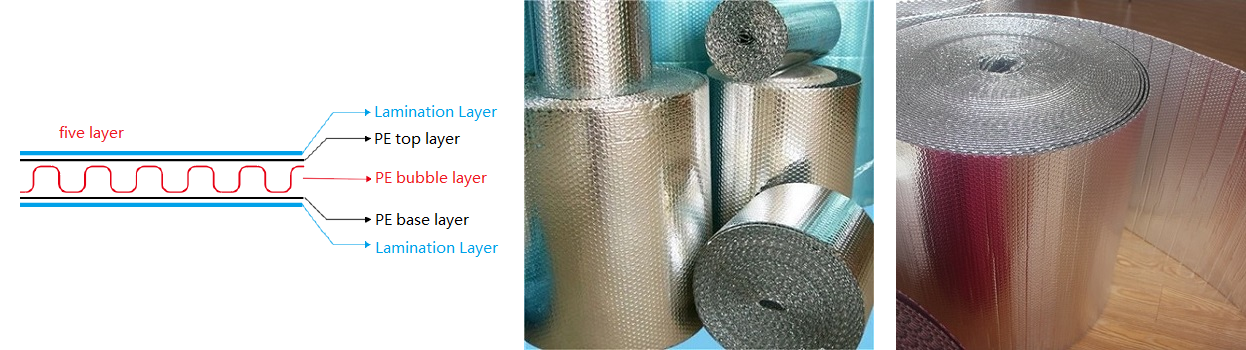 Five-layer air bubble film is mainly used as thermal insulation material, car sunshade making and etc.
